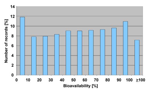 Within scientific publications, we have found two different descriptions of bioavailability, which were integrated into the knowledge base: qualitative and quantitative descriptions of bioavailability. The following figure shows the distribution of quantitative bioavailability values in PACT-F: