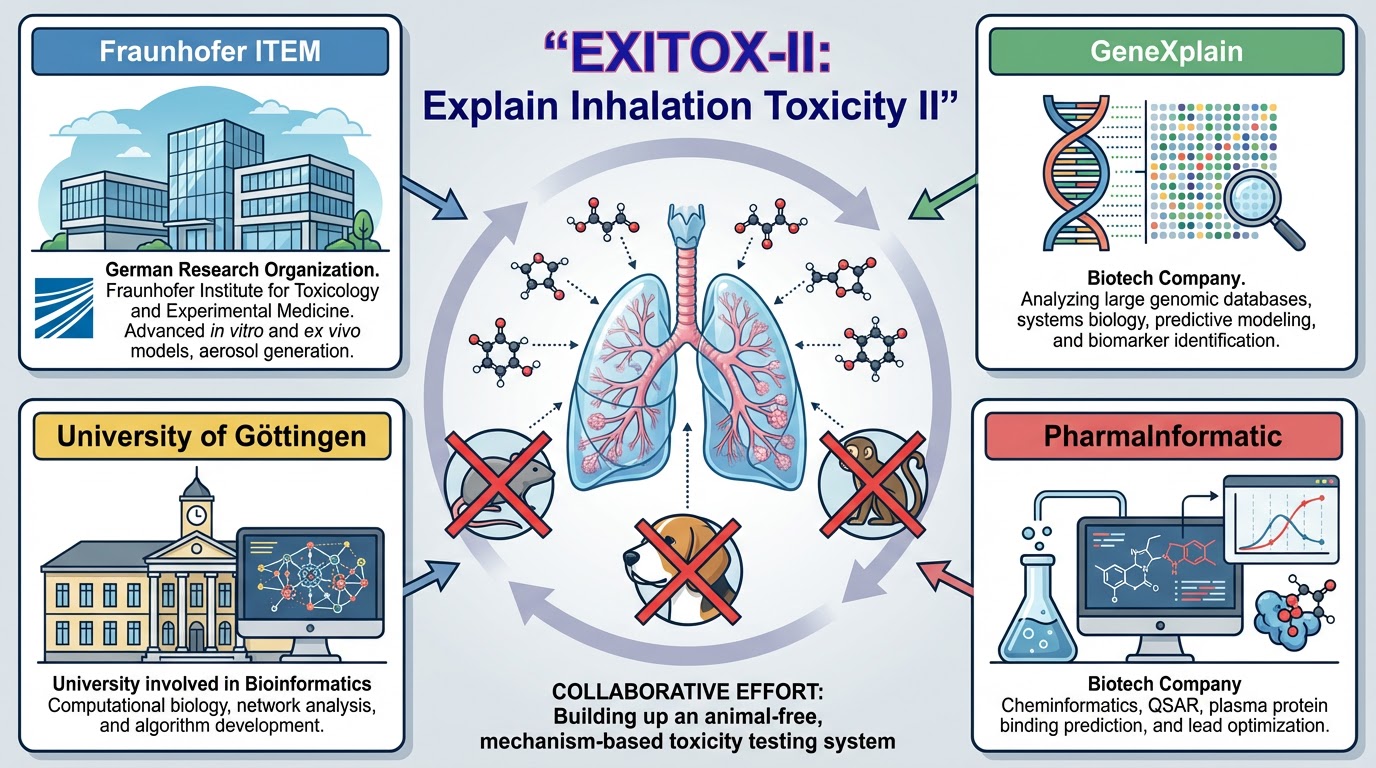 The collaboration between the University of Göttingen, geneXplain GmbH, PharmaInformatic, and the Fraunhofer Institute for Toxicology and Experimental Medicine (Fraunhofer ITEM) has developed an integrated approach for testing and assessment (IATA) aimed at replacing animal studies involving repeated inhalational exposure.