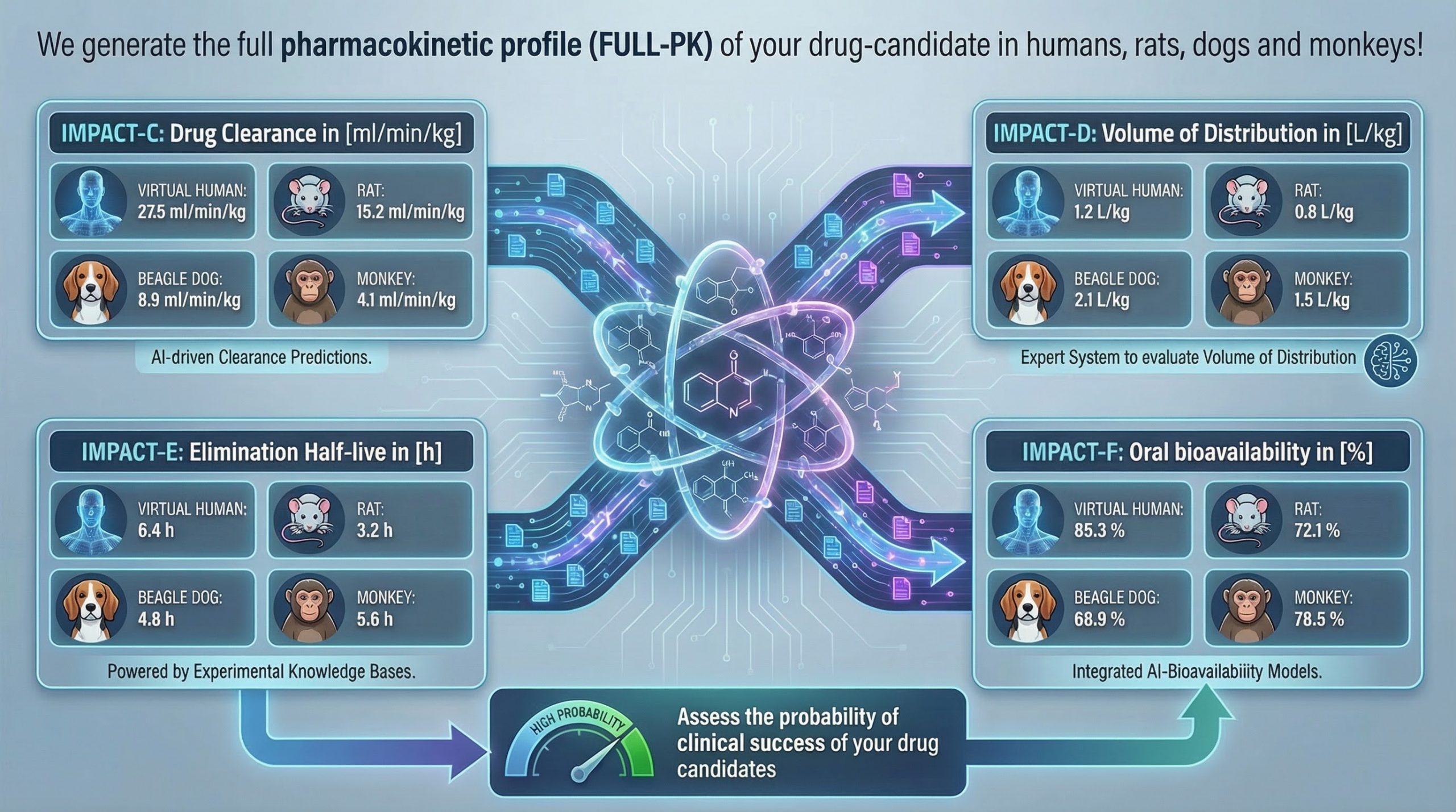 The expert system IMPACT-F assesses the oral bioavailability F% —the uptake of the parent, unchanged drug into the bloodstream—of a drug candidate in both humans and animals, including monkeys, dogs, rats, and mice. It is based on reliable computational models derived from the world’s largest knowledge base on bioavailability, known as PACT-F (Preclinical And Clinical Trials Knowledge Base on Bioavailability F%).