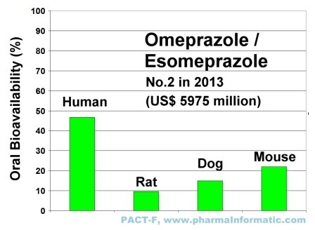 The following figure shows the differences of oral bioavailability in rats, dogs and mice and humans of Omeprazole: