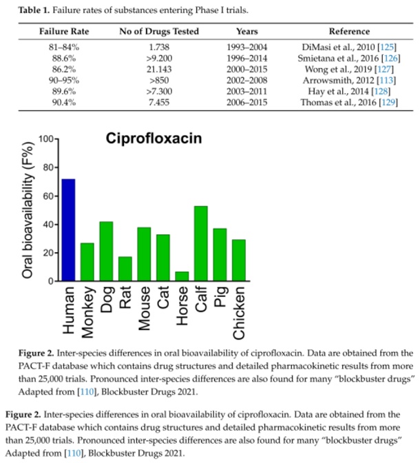 “For widespread diseases such as diabetes or cancer, drug development success rates are particularly low [111,112]. In general, only 5 to 10 percent of drugs make it to the market, despite being proven as safe and effective in preclinical animal studies [113,114] (Table 1). The high failure rate is attributed to species-specific differences and hence poor transferability from animal models to humans [115–117] (Figure 2).