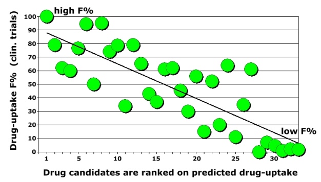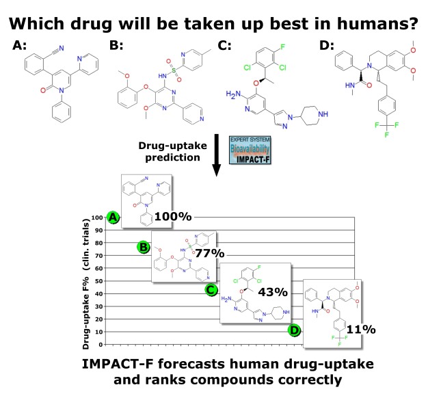 A drug must have sufficient oral bioavailability in humans otherwise clinical trials are not effective and drug development is then stopped. Oral bioavailability is one of the most important properties in lead optimisation. Low drug-uptake in humans can result in high inter-individual variability and increases the risk of side-effects and toxicity. IMPACT-F correctly ranks (prioritises) novel drug-candidates on human oral bioavailability. A validation study was carried out containing thirty-three independent drug-candidates coming from different therapeutic areas such as cancer, antibacterial or antiviral infection, CNS, inflammation, gastrointestinal and renal diseases, metabolism related diseases and cardiovascular diseases. |