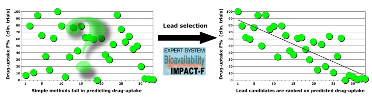 Our expert systems identify and prioritise promising leads and help to select drug candidates for successful drug development. IMPACT-F estimates drug-uptake in humans based on global QSAR/QSPR models and ranks candidates correctly: