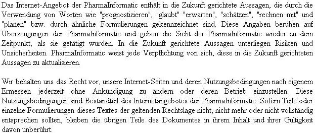Wir freuen uns über Ihr Interesse an der PharmaInformatic und an unseren Produkten und Dienstleistungen. Die Nutzung dieser Website unterliegt den nachfolgenden Bestimmungen. Falls Sie mit diesen nicht einverstanden sind, benutzen Sie unsere Internet-Seiten bitte nicht.
